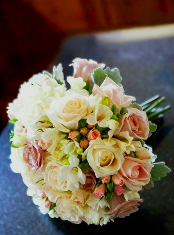 Ramo para novia con rosas, minirosas, freesias y follajes.