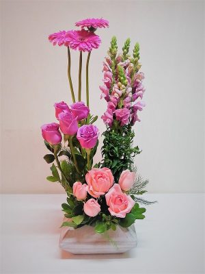 Florero con rosas, lilis, alstroemrias con moño de tela
