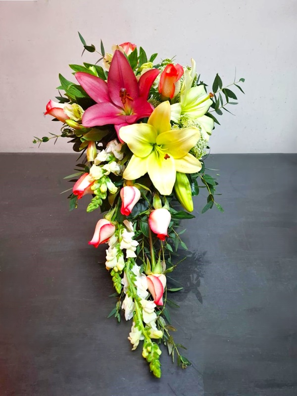 Ramo para Novia Natural con lilis, rosas, perritos, encaje y alstroemerias