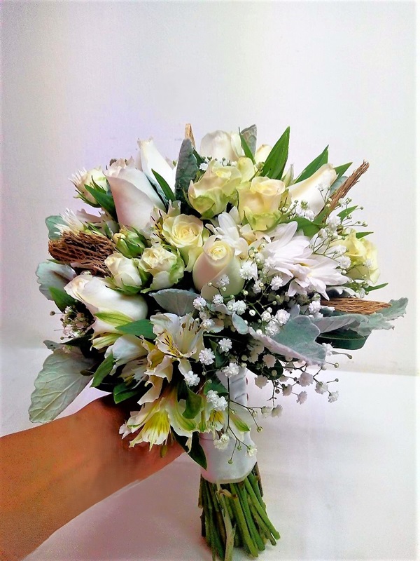 Ramo para novia con rosas ,minirosas, margaritas, alstroemerias, gipsophilia, follajes